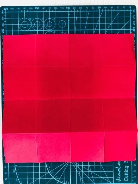 1.准备一张正方形的彩色卡纸,对折,折出16个格子