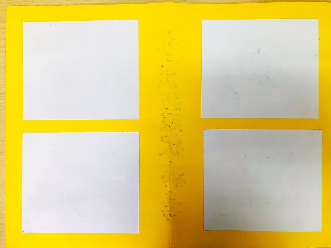 3.完成翻翻页制作(卡纸背面选用四个大于正面的长方形贴到背面、在正面翻翻页下的白卡纸上完成绘画内容)