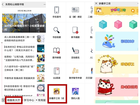 进入松山湖图书馆公众号首页,点击“微服务大厅”,下拉界面点击“妙趣手工坊”即可进入。