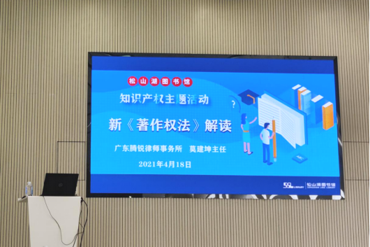2021年4月18日(周日)上午10:00,新《著作权法》解读讲座在松山湖图书馆一楼讲习室顺利开展。本次讲座邀请到广东腾锐律师事务所主任莫建坤律师作为主讲嘉宾,为大家解读最新修订的《中华人民共和国著作权法》的修订亮点。