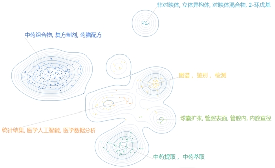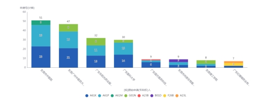 近年来松山湖公布的中医药相关专利一共385条,主要申请机构有东莞市中医院、东莞广州中医药大学中医药数理工程研究院、广东东阳光药业股份有限公司、广东医科大学、广东红珊瑚药业有限公司、优本健康科技(广东)有限公司等,所申请技术主要为A61K(医用、牙科用或化妆用的配制品)A61P(化合物或药物制剂的特定治疗活性)和A61M(将介质输入人体内或输到人体上的器械)(图1)。根据聚类地图(图2)显示,所有专利的核心词为中药组合物、中药提取、图谱检测、医学人工智能、立体异构体等,其中中药组合物相关专利一共有189条,是专利申请的热点。