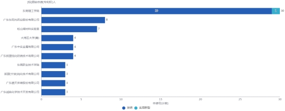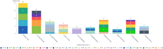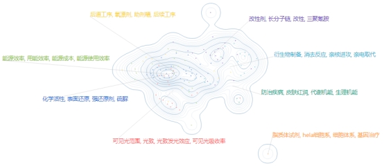 2024年1月至2025年6月松山湖公布的绿色制造相关专利一共131条,主要申请机构有东莞理工学院、广东东阳光药业股份有限公司、松山湖材料实验室、大湾区大学、广东中实金属有限公司、广东凯盟钝化防锈技术有限公司、东莞职业技术学院、凯盟(宁波)钝化技术有限公司等(图1),以上企业所申请专利技术主要为C07C(无环或碳环化合物)、C01B(非金属元素)、C02F(水、废水、污水或污泥的处理)和C07D(杂环化合物)等(图2)。根据聚类地图(图3)显示,所有专利的核心词为化学活性、衍生物制备、能源效率、脂质体试剂、改性剂等,其中改性剂、改性产品绿色制造的相关专利数量最多,是专利申请的热点。