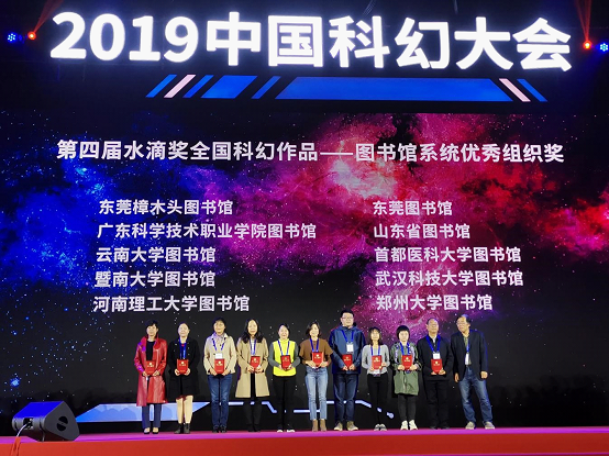 11月2-3日,由中国科学技术协会、北京市人民政府主办的2019中国科幻大会在北京园博园举办,本届大会主题为“科学梦想、创造未来”,会上为“水滴奖”举行颁奖仪式。颁奖仪式上,东莞樟木头图书馆、广东科学技术职业学院图书馆、云南大学图书馆、暨南大学图书馆、河南理工大学图书馆、东莞图书馆、山东省图书馆、首都医科大学图书馆、武汉科技大学图书馆、郑州大学图书馆等10个单位喜获“图书馆系统优秀组织奖”,由中国图书馆学会阅读推广委员会副主任、首都图书馆副馆长陈坚为各获奖单位颁奖。