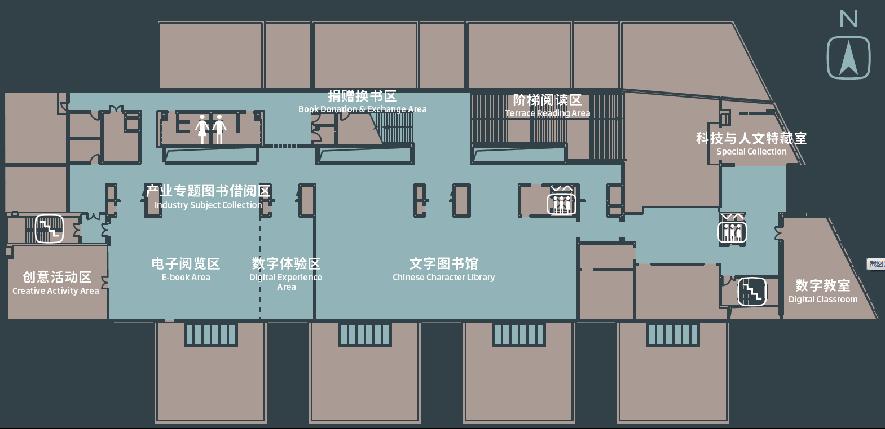 二楼包括:产业专题图书借阅区、电子阅览区、数字体验区、创意活动区、文字图书馆、捐赠换书区、阶梯阅读区、数字教室、科技与人文特藏室,均为免费开放区域。