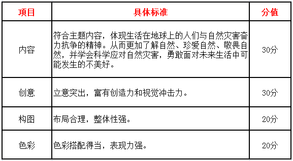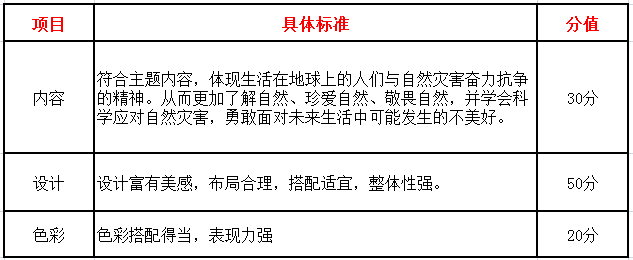 (2)作品内容:以“人与自然和谐共生”为主题,拿起手中的画笔来体现生活在地球上的人们与自然灾害奋力抗争的精神。从而更加了解自然、珍爱自然、敬畏自然,并学会科学应对自然灾害,勇敢面对未来生活中可能发生的不美好。
