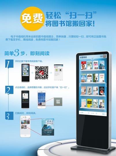 该体验区域配有瀑布流电子书借阅机、有声书借阅机、电子书借阅机、电纸书阅读本等数字化体验设备,以及数字资源扫码阅读海报架等,为读者提供数字阅读资源借阅、体验服务。