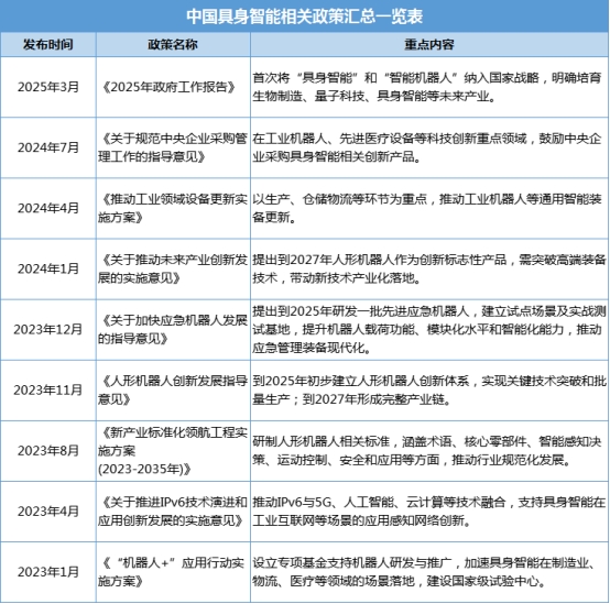 近年来,中国具身智能行业受到各级政府的高度重视和国家产业政策的重点支持。国家陆续出台了多项政策,鼓励具身智能行业发展与创新,《关于规范中央企业采购管理工作的指导意见》《推动工业领域设备更新实施方案》《关于推动未来产业创新发展的实施意见》等产业政策为具身智能行业的发展提供了明确、广阔的市场前景,为企业提供了良好的生产经营环境。具体情况列示如下: