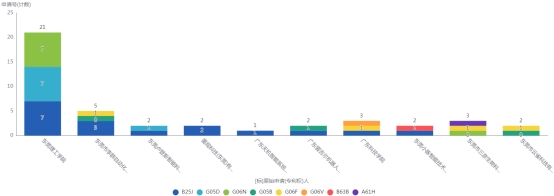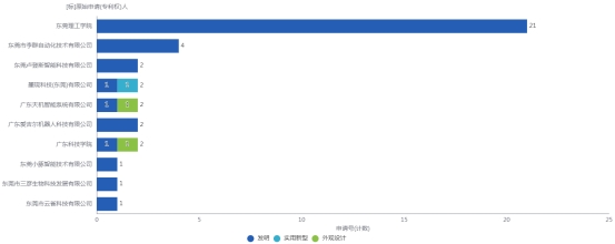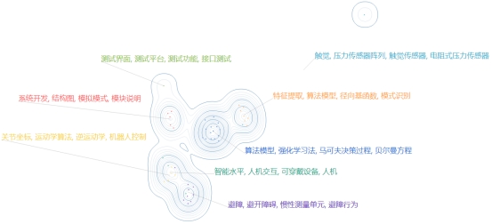 2024年1月至2025年8月松山湖发布的具身智能相关专利一共51条,主要申请机构有东莞理工学院、东莞市李群自动化技术有限公司、东莞卢登斯智能科技有限公司、墨现科技(东莞)有限公司和广东天机智能系统有限公司等(图1),上述企业所申请专利技术主要为B25J(机械手;装有操纵装置的容器)、G05D(非电变量的控制或调节系统)和G06N(基于特定计算模型的计算机系统)等(图2)。根据聚类地图(图3)显示,所有专利的核心词为算法模型、人机交互、模式识别、路径规划(轨迹跟踪)等,其中路径规划(轨迹跟踪)相关专利数量最多,是专利申请的热点。