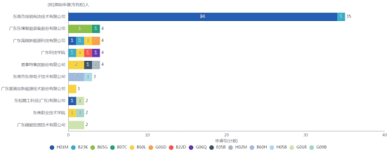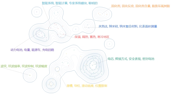 2025年1月至2025年10月松山湖发布的新能源汽车相关专利一共84条,主要申请机构有东莞市创明电池技术有限公司、广东东博智能装备股份有限公司、广东海棋新能源科技有限公司、广东科技学院和易事特集团股份有限公司等,上述企业所申请专利技术主要为H01M(用于直接转变化学能为电能的方法或装置,例如电池组)和B60L(电动车辆动力装置)等(图1)。根据聚类地图(图2)显示,所有专利的核心词为动力电池、充电回路、滑动底座、焊接方式和隔热等,其中动力电池相关专利数量最多,是专利申请的热点。