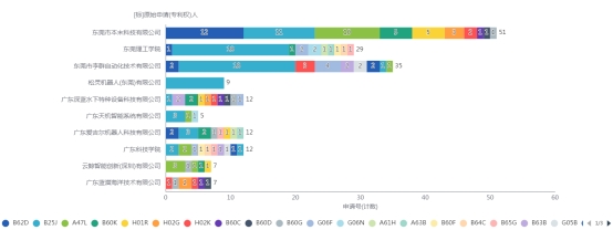 2025年1月至11月松山湖发布的机器人相关专利大约为212条,主要申请机构有东莞市本末科技有限公司、东莞市李群自动化技术有限公司、广东深蓝水下特种设备科技有限公司和广东爱吉尔机器人科技有限公司等,所申请专利技术主要为B25J(机械手;装有操纵装置的容器)、B62D(机动车;挂车)和A47L(家庭的洗涤或清扫)(图1)。