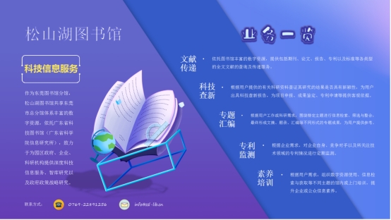 松山湖图书馆共享东莞市总分馆体系丰富的数字资源,同时与广东省科技图书馆开展深度战略合作,面向园区企事业单位、科研机构、政府部门提供免费的文献传递、科技查新、专利监测、专题定制、素养培训等深度信息服务,欢迎广大读者咨询。