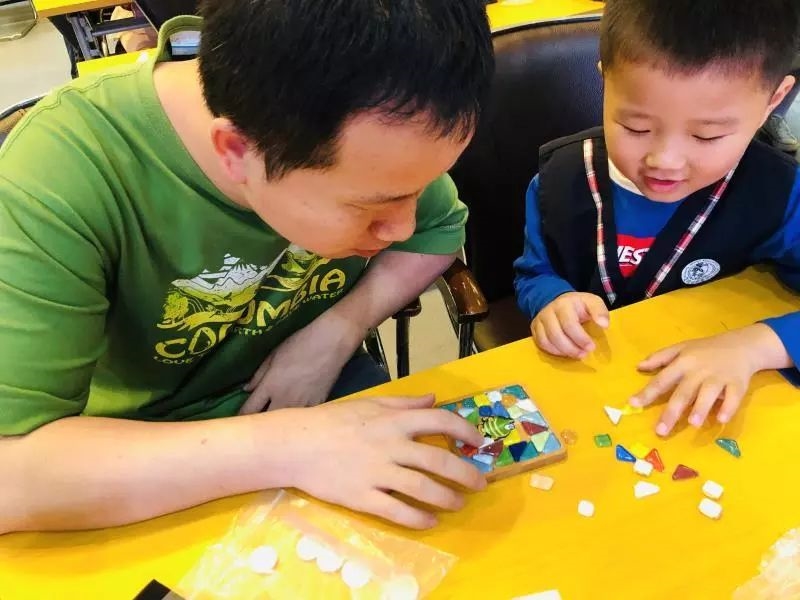什么是马赛克?为什么说马赛克是一种艺术?日生活中会见到马赛克艺术作品吗?带着这些问题开始今天的马赛克艺术之旅。六六老师首先给大家展示了一些漂亮的艺术马赛克作品:杯垫、相框、台灯、花瓶、烛台等。“哇……”小朋友们都觉得很神奇。接下来,在六六老师的带领下,家长和小朋友开始动手制作可爱的马赛克杯垫:图案组合、马赛克玻璃拼贴、涂胶、定型。看大家做的多认真啊!家长和小朋友都投入到这项神奇的工作当中,根据老师的指引充分发挥想象,精美的艺术作品一一出炉。