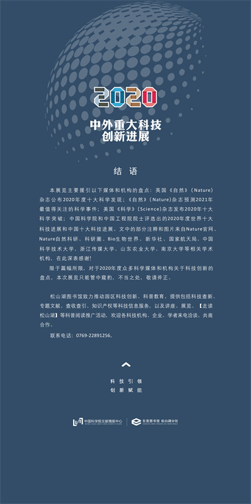 为此,松山湖图书馆携手中国科学院文献情报中心继续推出了“2020年中外重大科技创新展览”,撷取世界权威科学机构和著名科学媒体盘点的 2020 年度重大科技进展精华内容,希冀通过展示这些新进展、新发现和重大事件,不断扩展大家的认知边界,也丰富大家的文娱生活!