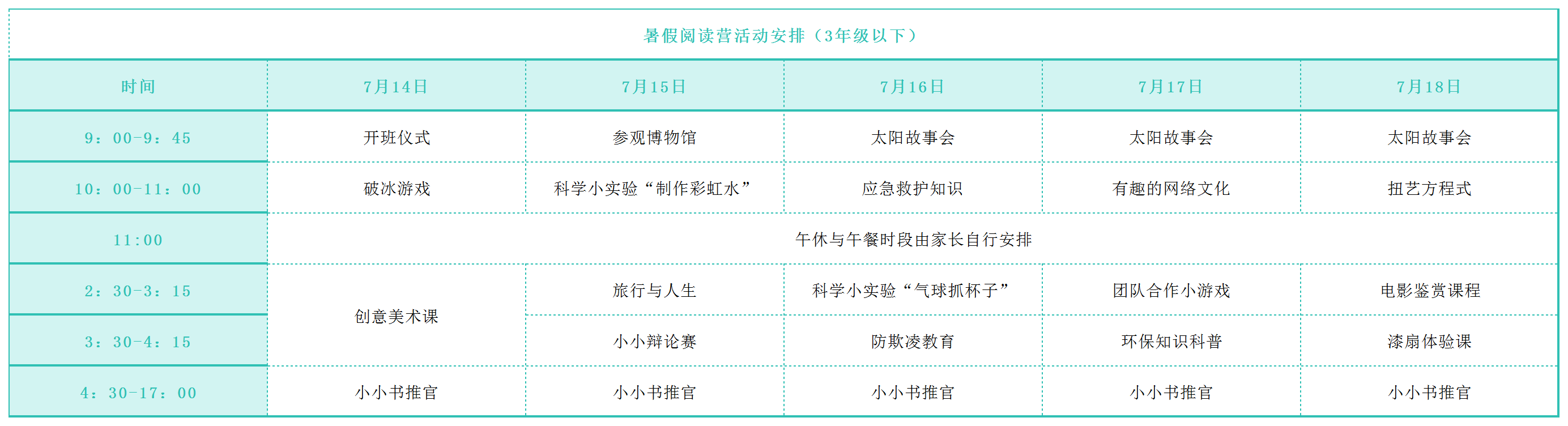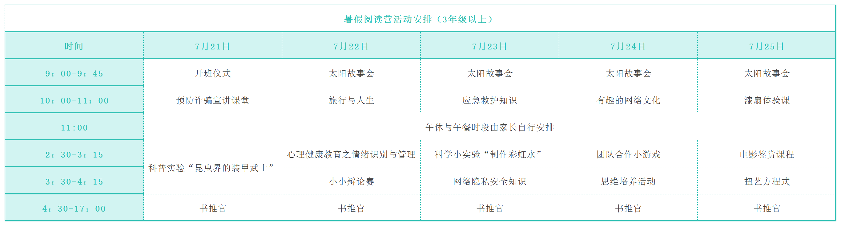 (3)阅读营提供午休看护及午餐订购服务(由第三方机构统一负责),家长可按需选择参与。